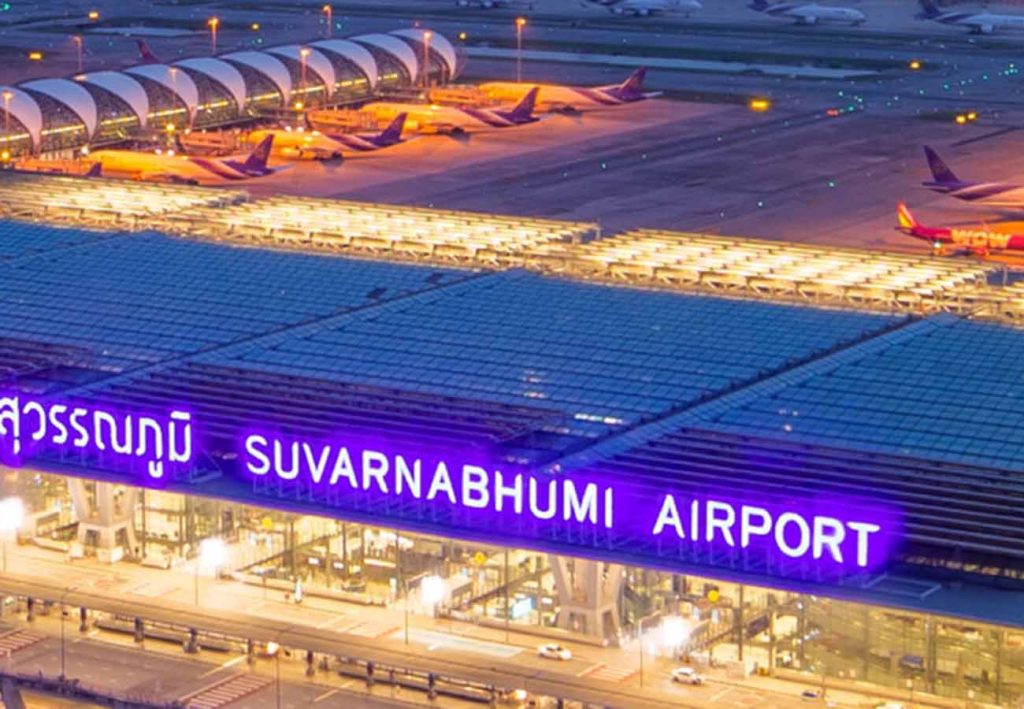 素万那普国际机场(BKK;英文:Suvarnabhumi Airport):也称泰国国家机场、新曼谷国际机场。位于曼谷东部,距离市中心约30公里,是主要的国际航空枢纽,提供多种交通方式前往市区,如轻轨和出租车。 2006年通航。