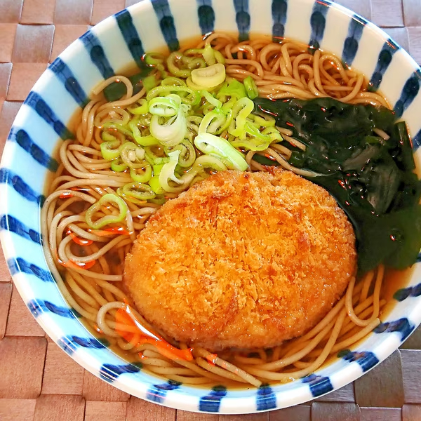 热腾腾的汤荞麦面上加上一个可乐饼。