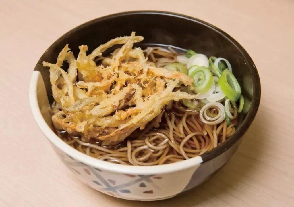 狸猫荞麦面是一种加了“天かす(ten ka su)”(日文也称为“扬げ玉(a ge da ma)”。也就是炸面衣屑)的汤荞麦面。这是荞麦面中算是最便宜的种类。