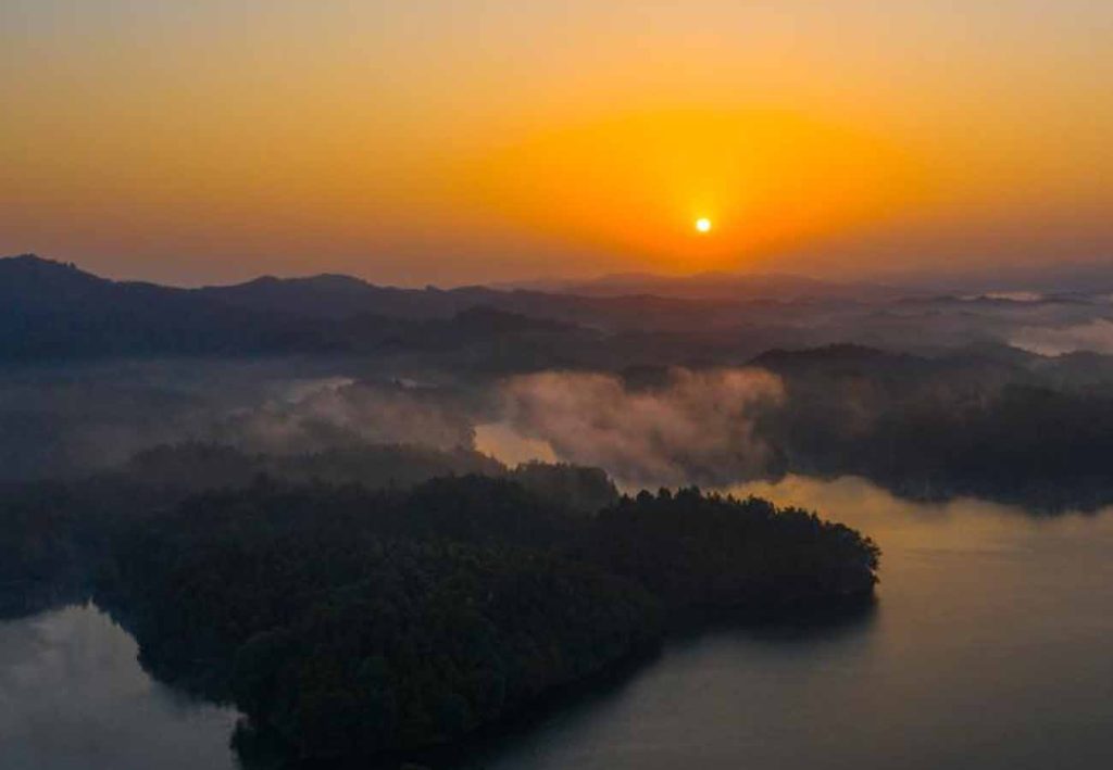 东晋干宝《搜神记》中“毛衣女下凡”的浪漫传说,便发源于此。仙女湖拥有50平方公里的辽阔湖面,景区内岛屿星罗棋布,清澈的湖水、青翠的岛屿、广袤的蓝天…置身仙女湖,真有一种流连瑶池仙境的感觉。仙女湖的美,不止于青山绿水,更有美丽的爱情传说。