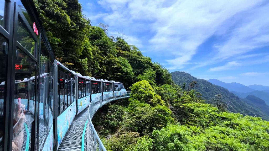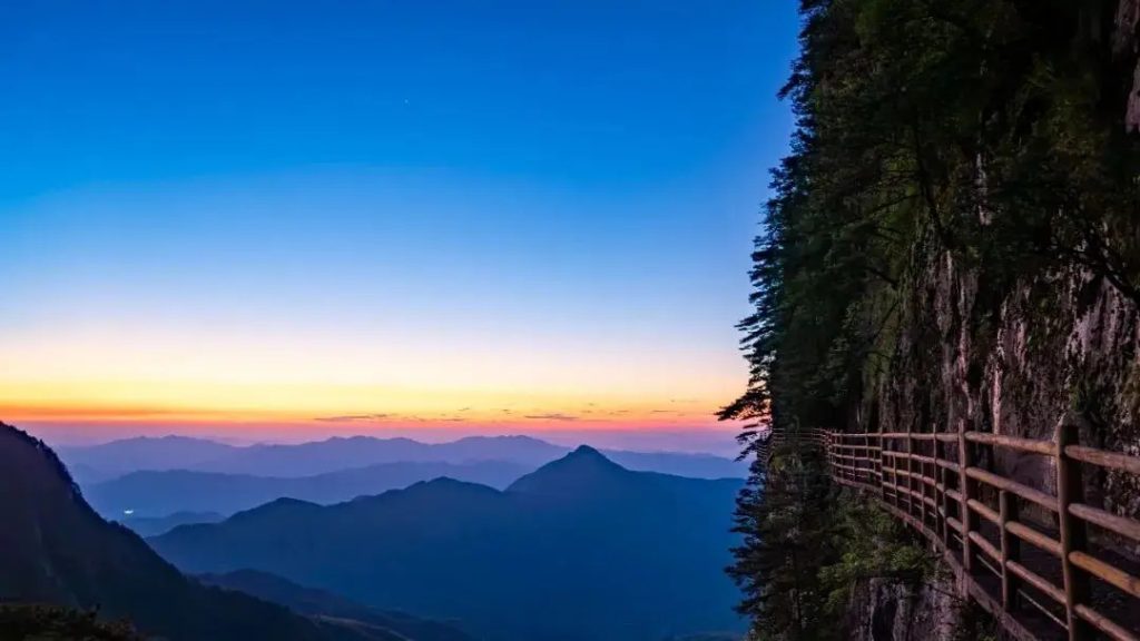 明月山是名副其实的天然大氧吧,森林覆盖率极高,空气中负氧离子萦绕,青云栈道悬于绝壁,脚下是云海翻涌,月亮湖澄澈如镜,映着青山绿树。