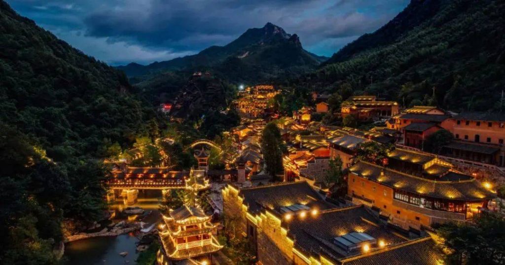 望仙谷是藏在峡谷间的神仙小镇,夯土民居依悬崖而建,飞瀑从崖壁垂落,溪水绕着古镇流淌。夜晚灯光亮起,悬崖吊脚楼被万盏灯笼裹成发光的蜂巢,瀑布砸在碧潭里的水雾漫过石阶,古街的灯笼影在石板路上晃啊晃,连空气里都飘着“此景只应天上有”的离谱感!