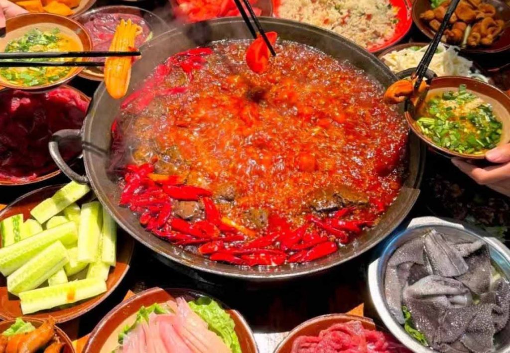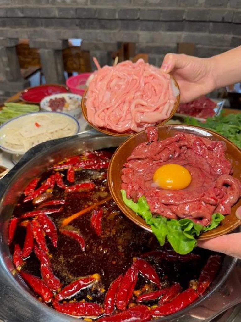 成都火锅以麻辣鲜香著称,牛油锅底搭配大量辣椒、花椒,涮煮毛肚、黄喉、鸭血、牛肉等食材,搭配香油蒜泥蘸料,热辣过瘾,是成都美食的代表。