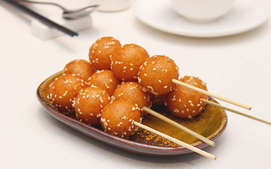 以糯米粉为主料,制成糯米团子炸制后裹上红糖浆和芝麻,色泽红润,外酥里嫩,香甜可口,是成都老巷子里的经典小吃。