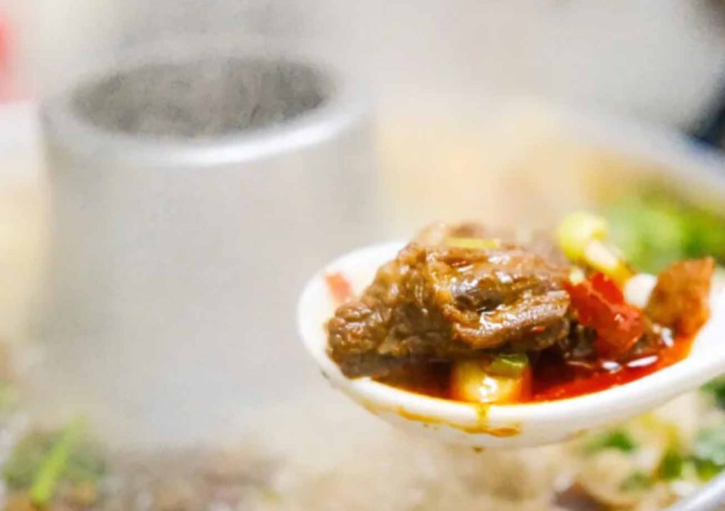 豆花是自己每天现做的,夹起来颤颤巍巍,在特制的蘸水里一滚,吸满辣椒、香菜的风味,非常入味;蹄花汤也是不错,提前熬好,豌豆煮得粉糯绵密,汤汁也微微粘稠。