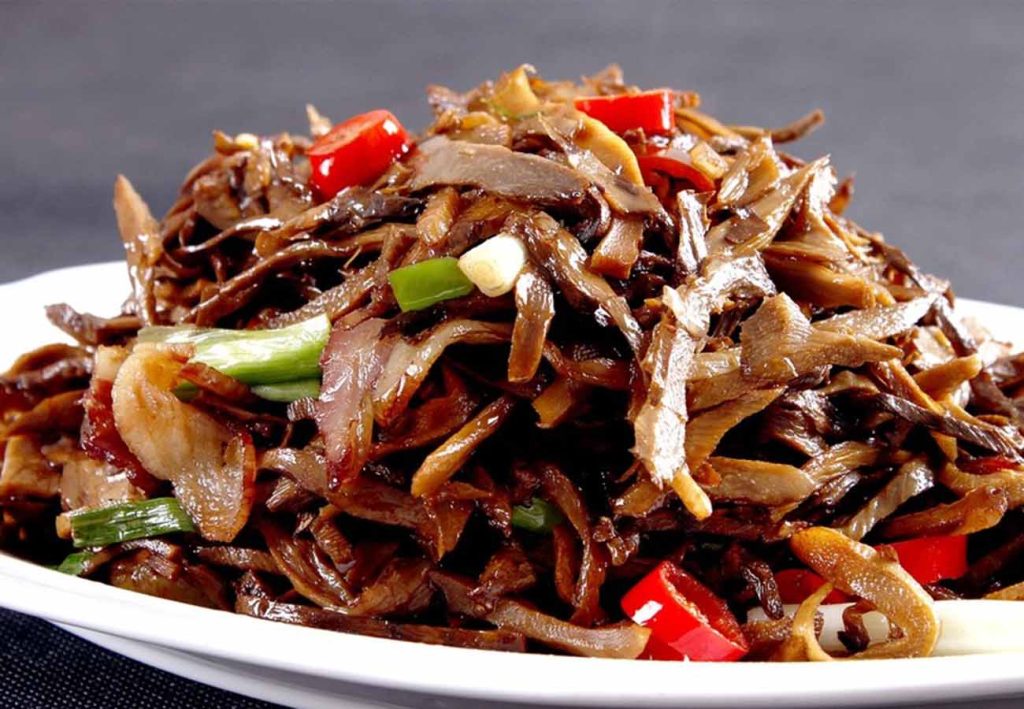 烟笋是江西井冈山的特产,是用新鲜的春笋经过熏制等工序加工而成,烟熏香味浓郁,还可以吸附汤汁,与五花肉是最佳搭档。这道菜做法很简单,起锅烧油,先放肥肉丝炒出油脂,再放瘦肉丝,炒至断生,放入蒜末、辣椒段爆香,最后放入泡发好的烟笋,加食盐、生抽、鸡精等调味,放入蒜苗,翻炒十几秒即可。
