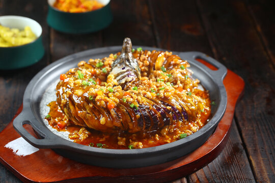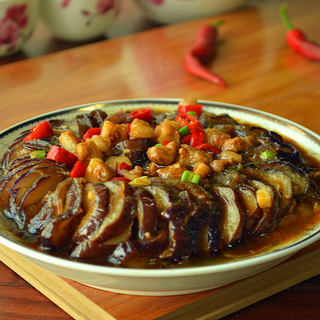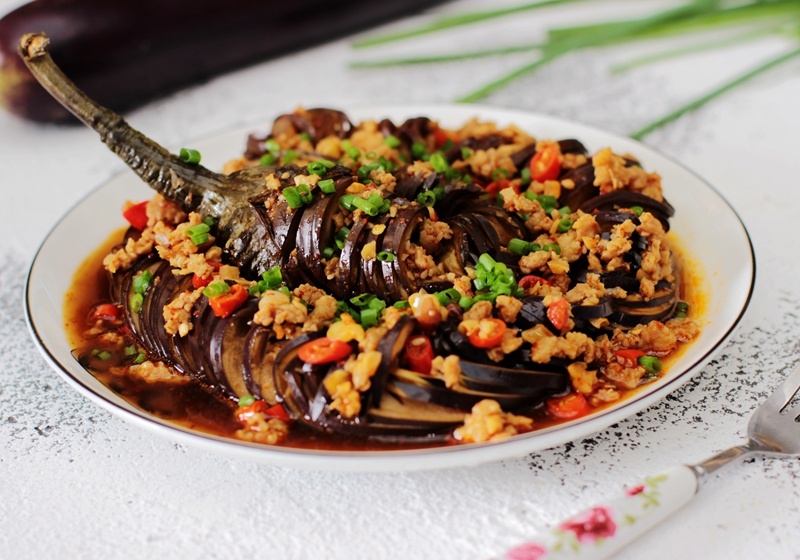 盘龙肉末茄子是江西的一道传统菜肴,曾一度风靡南昌大小馆子,不仅鲜香浓郁,味道极佳,而且颜值还很高。选用新鲜的长茄子,用蓑衣刀法切成螺旋形,下锅炸软控油,起锅烧油,放入肉末炒至变色,再放蒜片、小米辣、辣椒粉炒出香味,倒入开水,加生抽、老抽、蚝油、食盐调味,放入茄子,勾入水淀粉,大火收汁,出锅前撒上葱花即可。