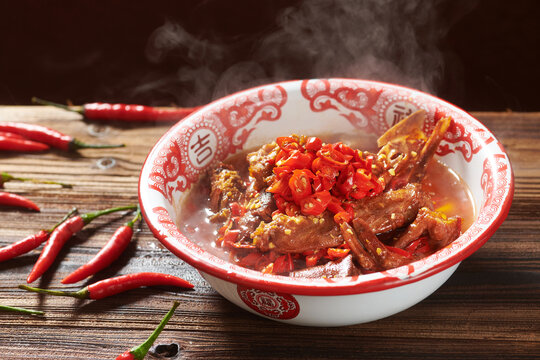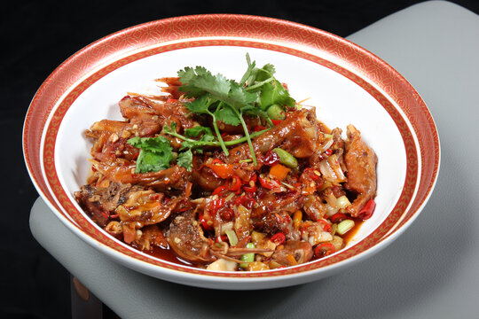 香辣鸭三件是江西人喜爱的另一种鸭肉做法,在江西小炒店和大排档里很常见,鸭货爱好者一定不要错过。先把鸭头、鸭翅、鸭脚三样食材处理干净,冷水下锅,焯水去腥,再放入高压锅中,加辣椒、八角、桂皮、香叶、酱油、啤酒炖制七八分钟,再起锅烧油,放入姜蒜辣椒炒香,倒入鸭三件翻炒均匀即可。做好的鸭三件香辣入味,啃起来非常过瘾,特别是搭配小酒吃,真是神仙搭配。