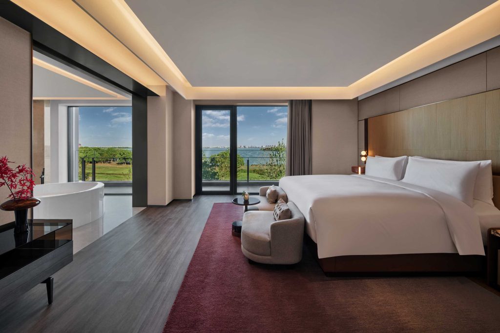 酒店共设有277间客房、套房及独立别墅,整体以原木色调为主,融入了太湖石装饰、中式屏风等苏式元素,有着江南韵味。每间客房均配备阳台,可以欣赏到葱郁的园景,或迷人的阳澄湖风光。