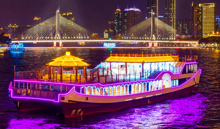 全程1小时左右的航行会带你领略珠江沿线的众多广州重要景点,让你沉浸在这片醉人的珠江夜色中。数座跨江大桥临头而过;欧式古建群沙面清晰可见;色彩缤纷的广州塔直冲云霄;繁华的珠江新城一片喧闹。