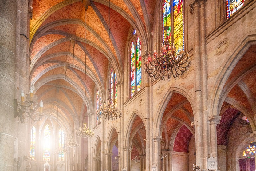 教堂平面为拉丁十字形,门楣上饰以圆形石雕,中嵌镂空雕刻的玫瑰花窗,顶部为两座高耸的八角尖顶石塔,其中西塔镶机械大时钟。教堂内部的尖拱、飞扶臂、交叉肋拱极为华丽。最让人赞叹不已的是精美的、描述《圣经》故事的彩绘玻璃花窗,最好挑一个有阳光的日子前来,当阳光穿透彩窗,把教堂渲染得梦幻而不失神圣感。