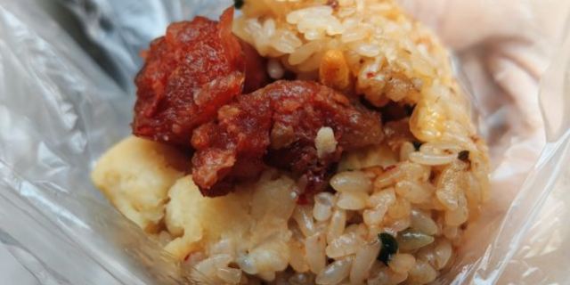 一份糯米饭,要香肠就少点饭,不要香肠就多点饭。小料很多,舀一大块米饭,快速的将小料填到糯米上,再包好。早早牵开袋子站在旁边等着,热滚滚的糯米饭倒到袋子里,稍微团一团就是个圆滚滚的糯米饭球。爱吃辣的一定要来一大勺辣椒酱,红油把大半个饭团都染得油亮油亮,香辣可口,层次丰富。