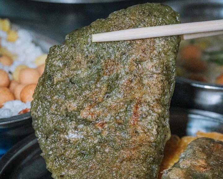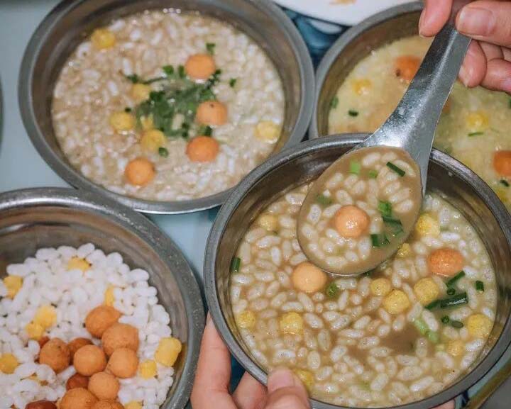 每桌一个壶,3元一个人就可自助畅喝。绿豆油茶口感比一般的油茶口感更醇厚,一口下去有些许苦涩,但紧接着细嚼炒米会品尝到甘甜的滋味,还有着清热消暑的作用。桂林人喝油茶自然是少不了粑粑的搭配,首推芝麻馅的野菜粑粑,手工制作,两面煎得焦脆,里面软糯柔韧,野菜的清香让人回味悠长。