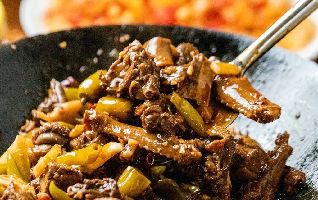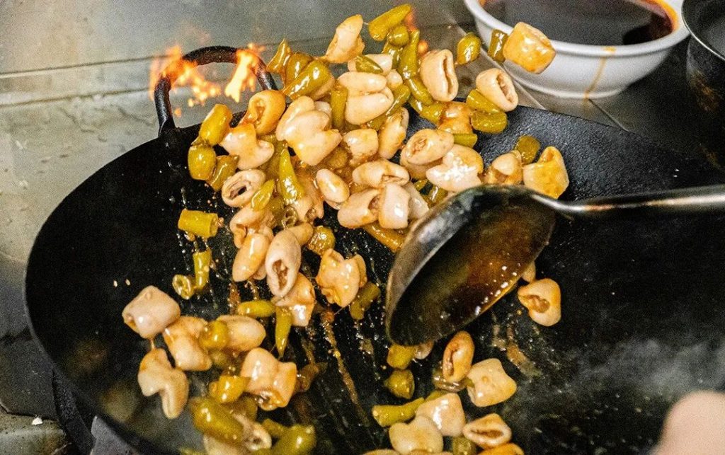 一滴水不加的泡椒二股肠,锅气全靠猛火炒!一定要趁热吃,刚出锅的肠,饱满得简直要“嘭”出来,夹一块放嘴里,又嫩又脆还会爆汁,而且一点腥臭味都没有。