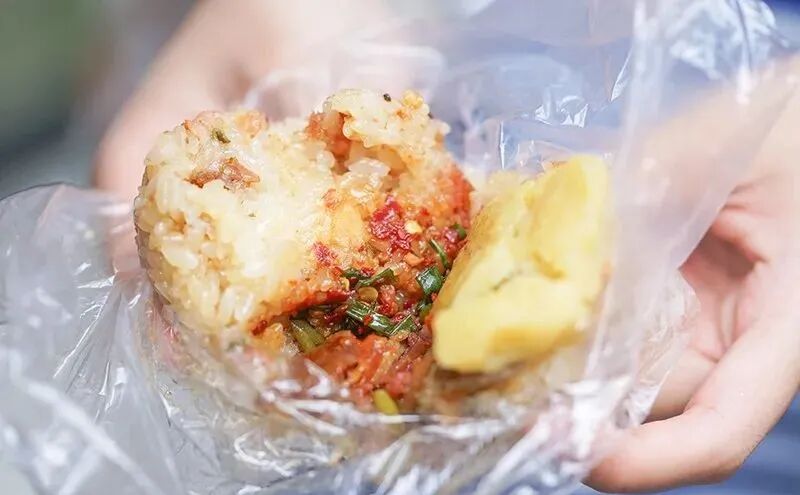 每逢端午,那长长的队伍更是成了一道节日风景线。“绿豆鲜肉,帮剥起!”吃完懒得洗手的人都这么买,剥好的粽子装进塑料袋里就可以直接吃,省去了剥粽叶的功夫,馅料丰富,一口大满足。塞在粽子中间的一块五花,加热后肥的部分已半融化,有人就爱吃芯芯这口,油润香浓。