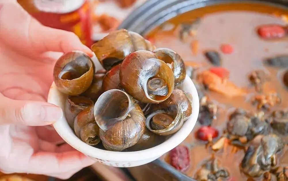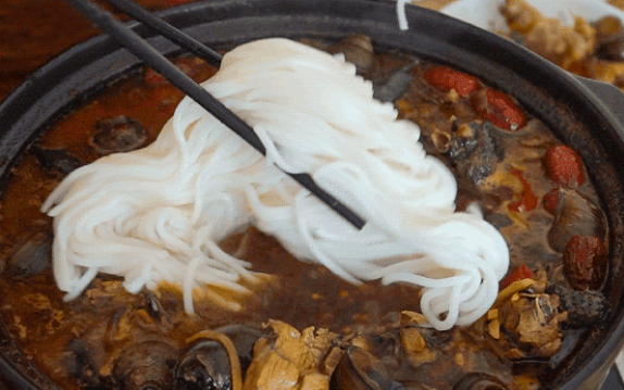 一锅螺蛳鸡里有很多螺蛳,螺蛳个大肥美,螺肉吃起来Q弹有嚼劲,精选的乌鸡吃起来还带着一丝鲜味,很过瘾!汤底也不能浪费,因为加了红枣的原因,这锅螺蛳鸡汤不管是单独喝汤还是用来涮米粉,那个鲜味在你的嘴巴里蔓延开,粉越嗦越香!
