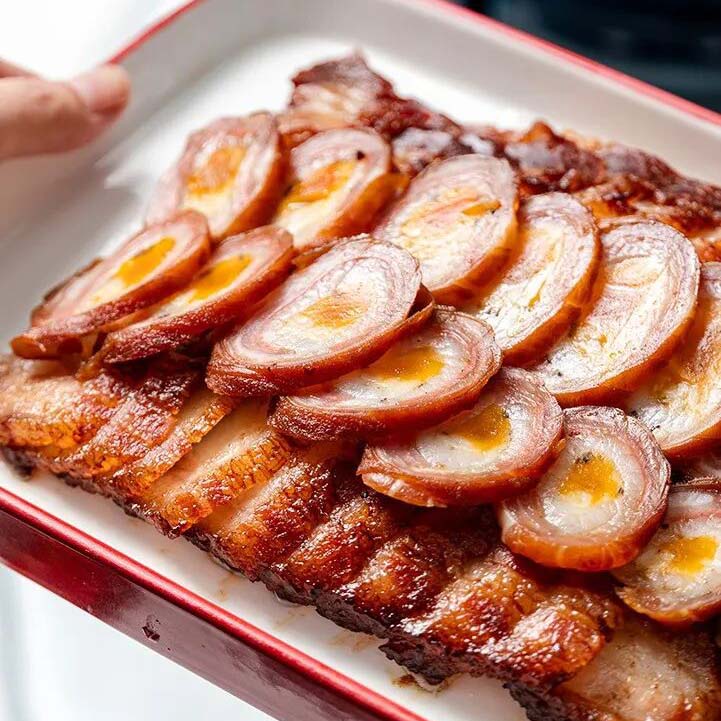 桂花扎叉烧,是近乎失传的传统粤菜,纯手工制作,三代师傅坚守的繁复工艺,入口先是肉肠的鲜香,再紧跟着咸蛋黄的咸香,酥软和沙糯交织。