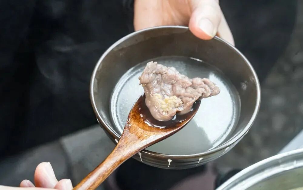 进店必点的全牛汤,需要在不足100L的临桂瑶品淡泉水中加入150斤左右的牛骨、牛肉、牛肠、牛舌、牛头皮……佐以12种天然香料,熬制12小时,颜色由透明变为金黄。鲜美、爽口、纯粹,这碗全牛汤对老顾客的吸引力始终如一,什么料往里一烫都会成为极致的享受。