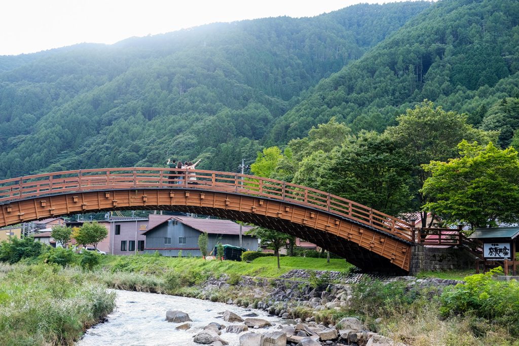 踏入奈良井宿之前,必先经过木曾大桥。这座横跨奈良井川的太鼓桥,落成于1991年,以山口县锦带桥为蓝本,取树龄三百余年的木曾桧木筑成。作为无桥墩的木制桥梁,其规模在日本屈指可数。桥的设计也很有意思,国道一侧有20级台阶,奈良井宿一侧则是21级,寓意着“从20世纪走向21世纪的梦幻之桥”。每年四月上旬到十一月下旬的日落后,灯光会为大桥披上柔光,白木色的弧线浮于夜色,倒影落在奈良井川水面,远山如墨,漫步桥畔广场,便能遇见奈良井宿最美的夜。