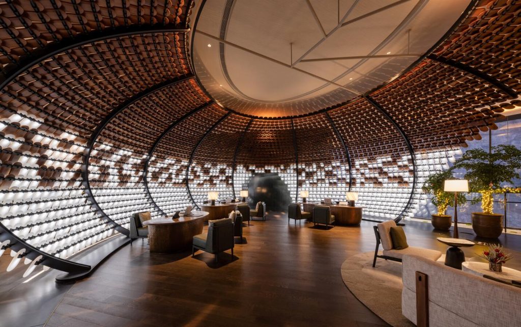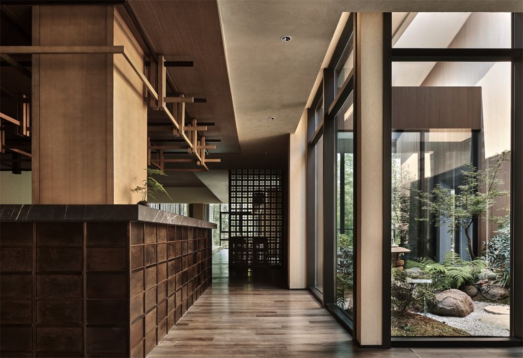 从酒店大堂拾级而上,宫殿登堂入室的仪式感油然而生。大堂以水为系,主打镂空栅格设计,让整个极简美学空间通透明亮,与周边绿色美景自然相融。