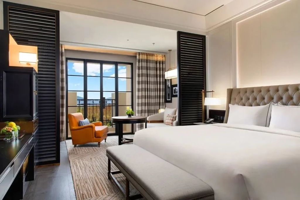 酒店共有262间客房,部分客房直面高尔夫球场,不出房间就能看见秀美的果岭胜景。房间内设计融合东方传统美学与欧式高贵优雅,延续公共空间的黑、金双色搭配,配以木制百叶窗等复古装饰细节,营造出府邸式的居住氛围。