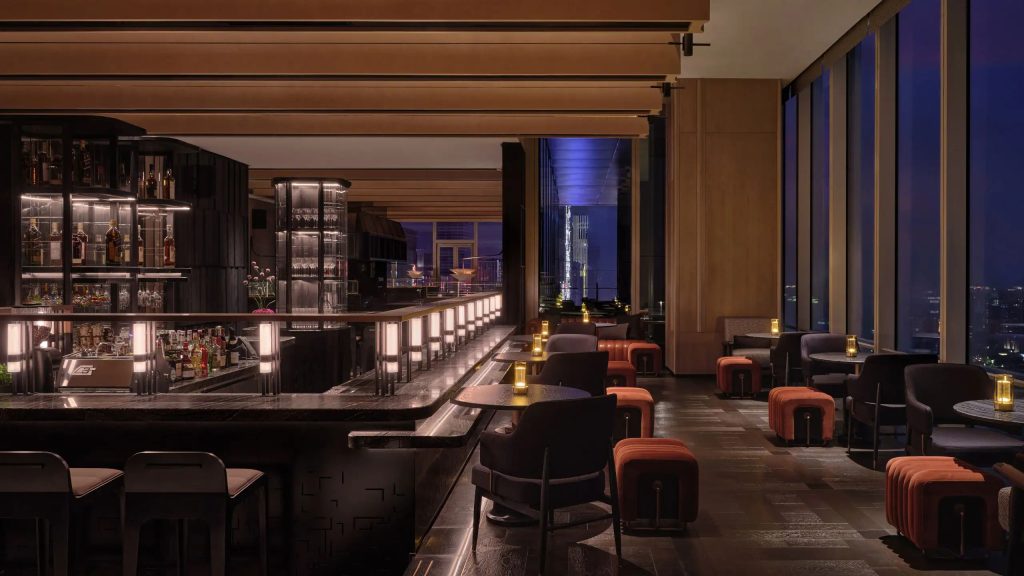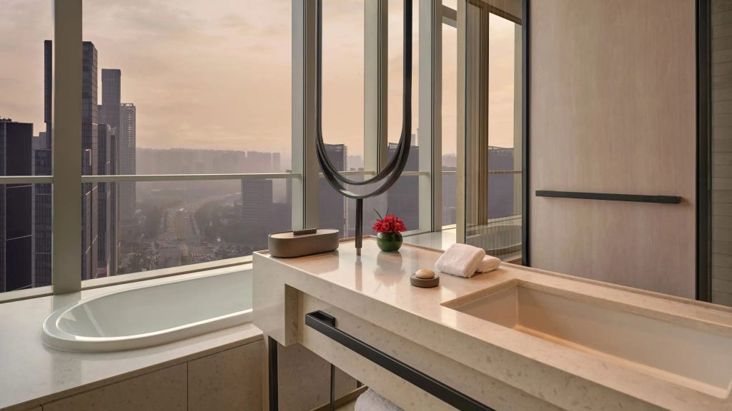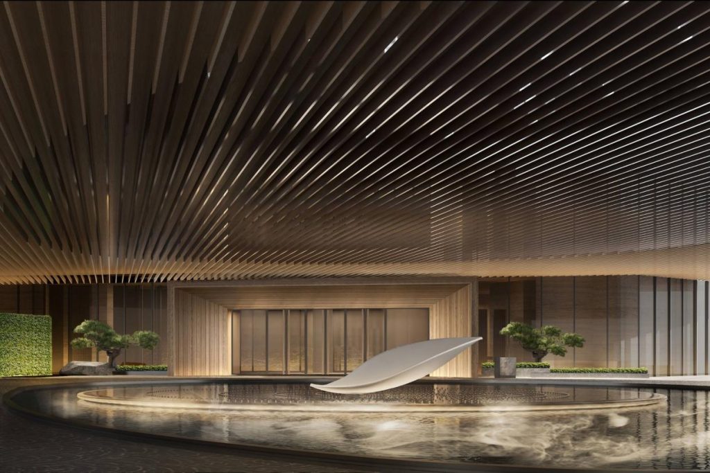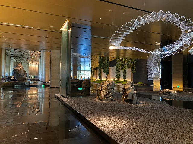 南京丽思卡尔顿酒店坐落在南京新街口繁华街区,背靠奢侈品云集的德基广场购物中心,北望玄武湖,东眺紫金山,出门就是中山路梧桐大道。酒店门口矗立着哥伦比亚艺术家打造的白色大理石雕塑《节奏》,另一侧是数棵专程从日本空运的百年罗汉松。
