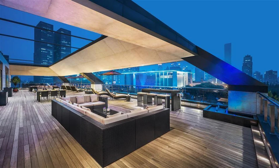 南京河西安达仕酒店外观由国际知名建筑事务所KPF操刀,以水晶簇为灵感,通体为玻璃幕墙,呈现出时尚璀璨的水晶摩天大楼。6层户外露台花园是酒店魅力名片,深耕中式园林对称美学,用景观水池和盎然绿植,在四周摩天大楼合围中造就了“闹中取静、大隐隐于市”的空中秘境。