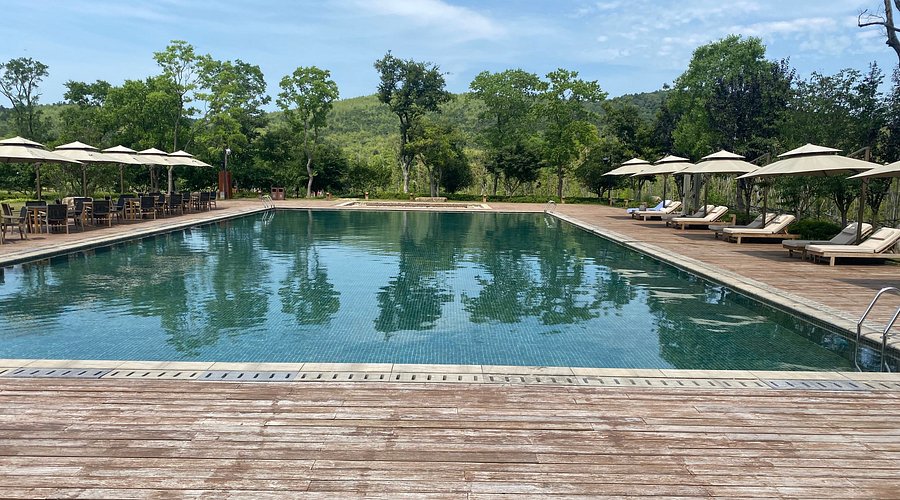酒店建筑沿地势而建,和周围的自然气韵一脉相承,仿佛拔地而起,自带避世感,静谧的环境,少了很多都市的喧嚣。绿树掩映下的户外泳池,给你度假的闲适恬淡,清晨可以享用网红泳池早餐,野趣十足。