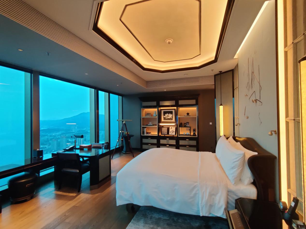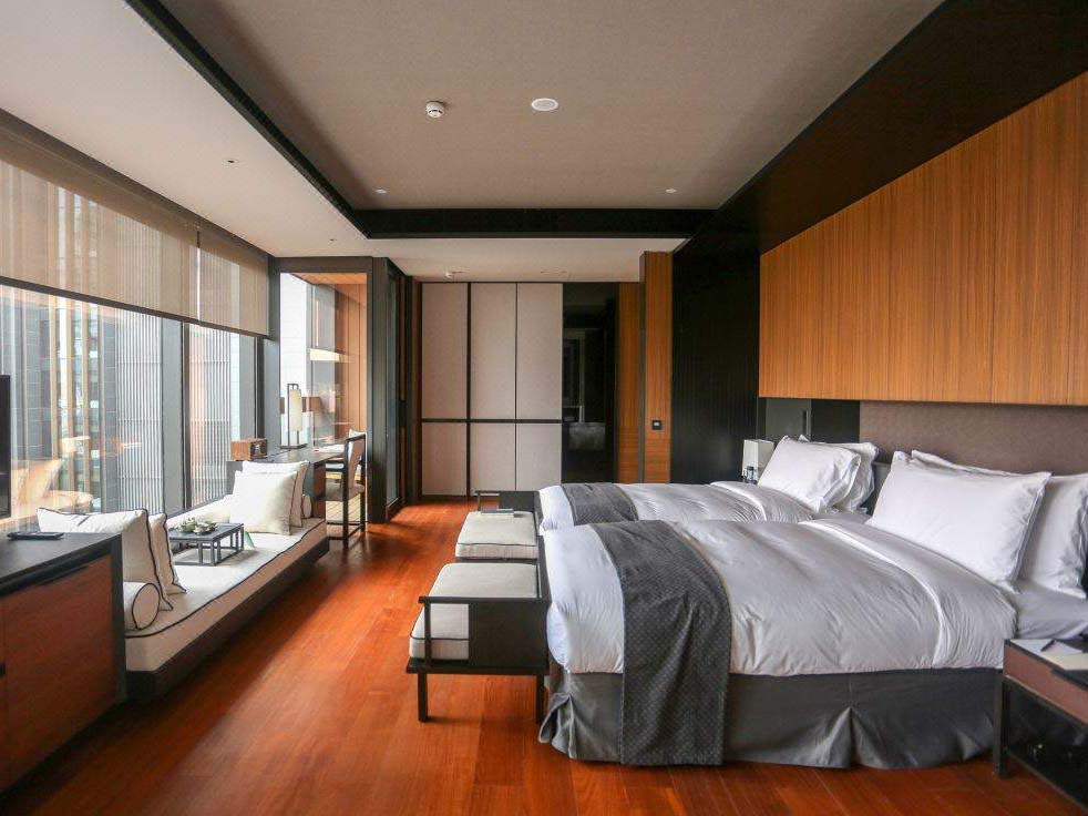 酒店打造有295间舒适客房,面积50㎡起跳,室内设计致力于将东方美学与西方经典风格结合,包含有步入式衣帽间、卧室、办公区、休息区沙发和浴室等功能区,给你入住小型套房的质感。