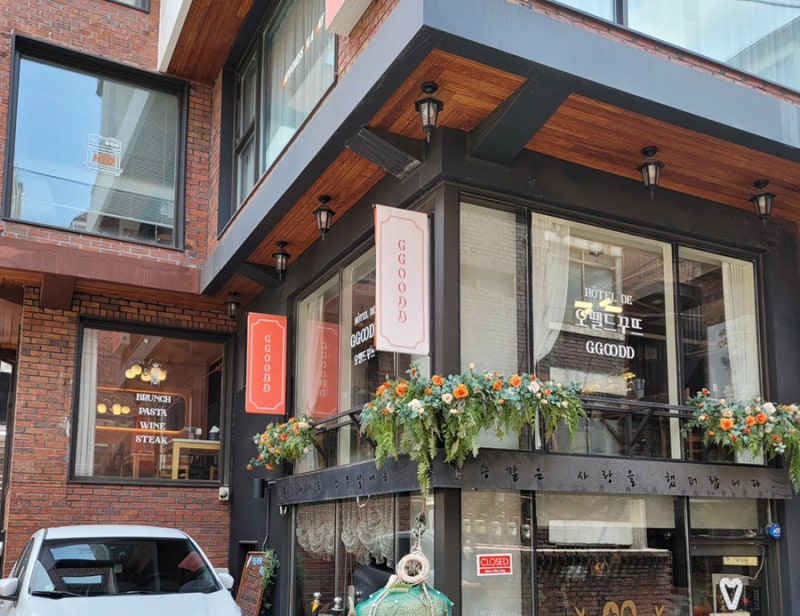 开在延南洞的Hotel De GGOODD,一家主打意面的西餐小馆。店面古典华丽,又带有点美式的氛围,还蛮有异国风情的。招牌的蜜蜂培根意面奶油味十分浓郁,咸甜交织的味道很特别,还带点微微的辣度,爱吃意面的朋友可以来打卡试试。