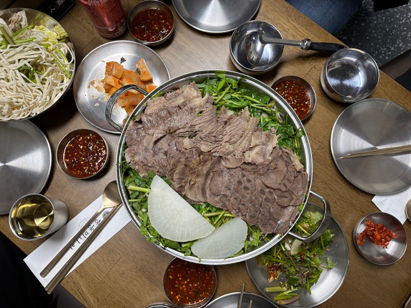 每桌必点的生牛肉拌饭和水芹牛骨汤,分量都蛮大的,水芹菜汤清新鲜美,牛肉也煮的恰到好处,搭配上店内特制的酱汁调料,吃过一次就十分难忘。
