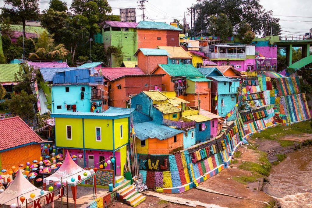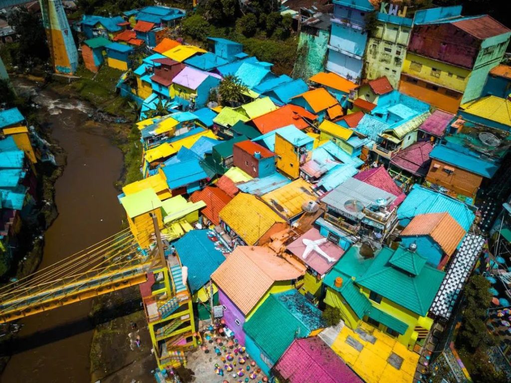 位于印尼玛琅的彩虹村,原本是当地的贫民窟,经过当地大学生和地方当局的创意改造,如今蜕变为一个充满活力的艺术村落。就这样,命运的齿轮开始转动,这个小社区的命运发生了变化。幸运的是,计划不仅获得了地方当局的认可,学生们还设法联系到了涂料制造商,共同支持这个斑斓的造梦项目。2016年,乔迪潘村脱胎换骨,从一个破败的贫民窟变成了一个色彩鲜艳的村庄,在网络上爆火,每天吸引近千名游客。