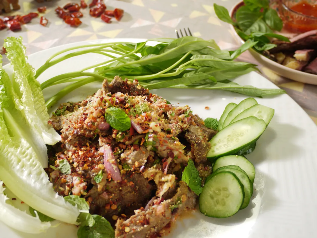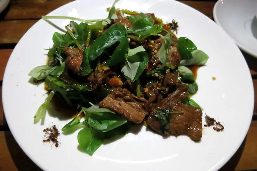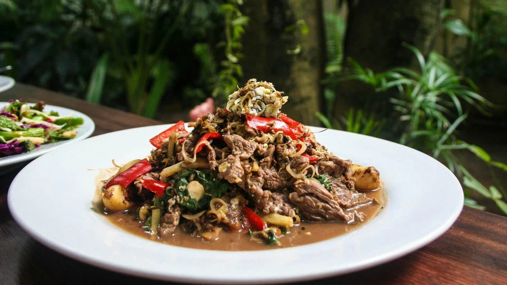 在金边的Cuisine Wat Damnak餐厅,主厨Joannès Rivière用法餐技法重构高棉食材,创作出了蚂蚁牛肉沙拉等独特美食。这道菜将炸蚂蚁与牛肉、香草等食材混合,口感丰富,充满创意。