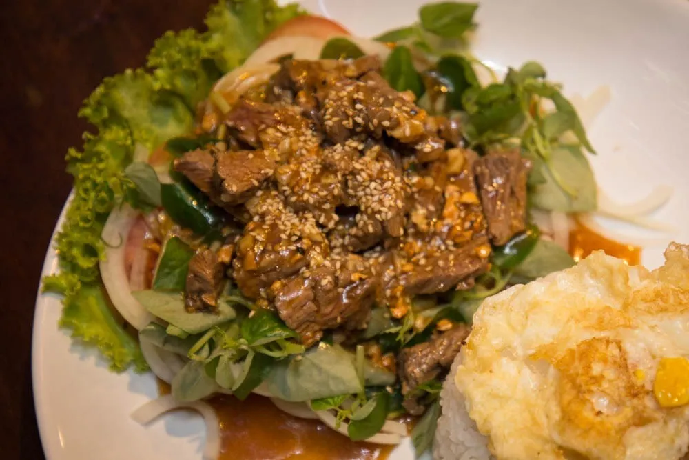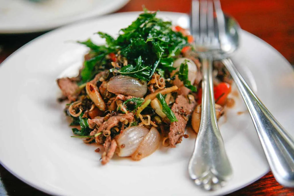 这道菜是殖民时期的法越融合菜,将牛肉片与黑椒、生菜和酸橙汁一起烹饪,口感鲜嫩,酸辣适中。在暹粒的Red Piano餐厅,你可以品尝到这道经典的高棉风味菜肴。