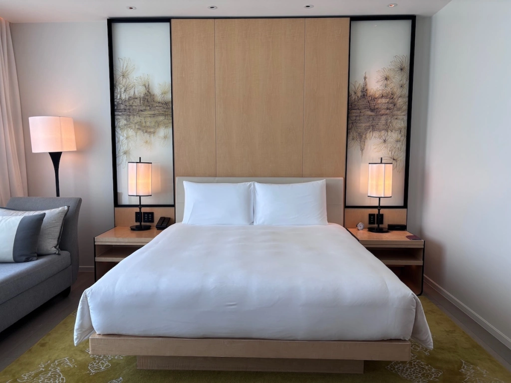 酒店拥有299间客房,此次我们入住了可以眺望湄南河的至尊河景房。入住不久就在房间内看到了绚丽多彩的晚霞,给我带来惊喜,让人心情大好。喜欢客房的色泽,素雅现代,分区明确,简洁中透露着设计细节。为了最大限度地给宾客带来宽敞和舒适的入住体验,让身处客房的我,无论是坐在沙发休憩,还是穿梭在起居室与洗浴空间,都显得随心自如,毫无局促之感, Jean-Michel Cathy 特地简化并打开了客房内一切有可能剔除或开放的空间,其浴室的墙体几乎全部由抽拉门取代,让浴室、玄关和客房空间可以很轻松地融为一体。