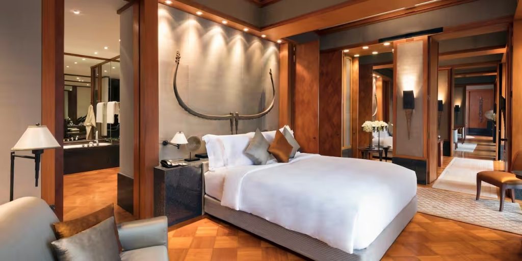 酒店的52间套房堪称曼谷最宽敞的住宿空间之一,面积从94平方米起,均拥有全景落地窗,将奈乐公园的绿意或城市天际线框成一幅动态画作。细节处尽显泰式风情与匠心:床头板采用香蕉树皮板材拼接,模仿泰式屋檐的优美曲线;墙面的石膏树脂浮雕抽象描绘了曼谷的Soi小巷;迷你吧巧妙地隐藏在传统的泰式橱柜之中。