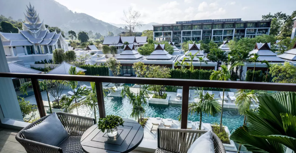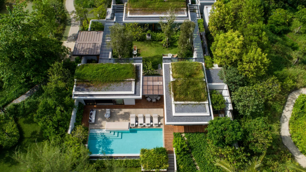 酒店拥有221间客房、套房与别墅,分布于山坡与海滩之间,以泰式传统建筑元素为骨架,现代材质与自然肌理交融。设计灵感取自“天光寺庙”(Wat)的建筑布局,中轴对称、静谧包围,构筑一种精神性的秩序。