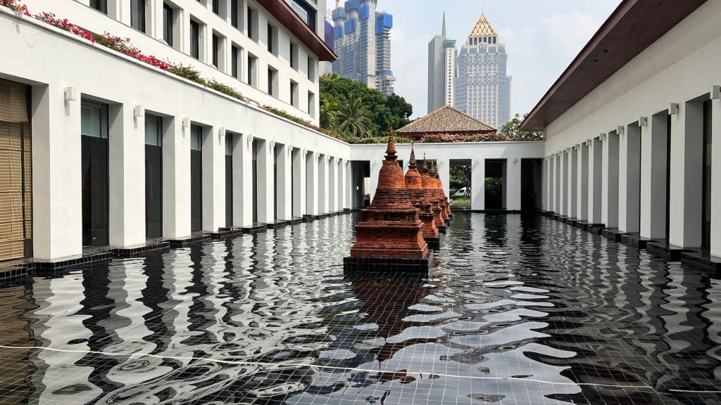 虽然酒店修建在最繁华吵闹的金融区,但是从主路进入要先经过一条长长的内部道路。主路入口处的酒店标识旁就是9只并排立在小瀑布水池中的佛塔。9在泰语里因谐音的关系,意喻到达彼岸,有吉祥含义。塔所在的水域不能是死水,所以但凡造景水中有塔,一定配以喷泉。