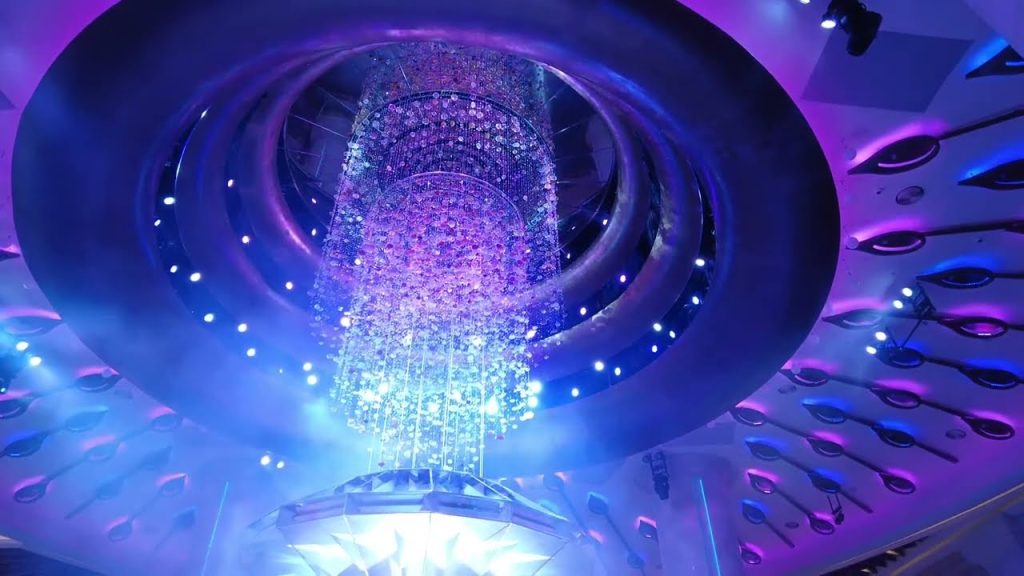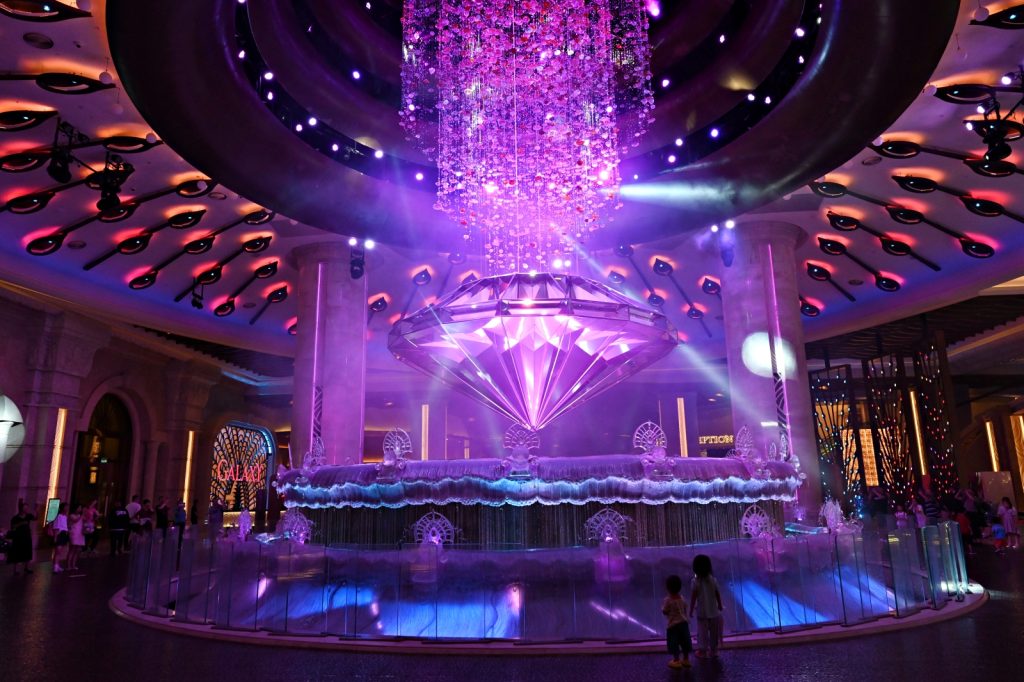 在酒店大堂的正中央舞台,随着音乐及声光效果的呈现,高达3公尺的的闪亮超大钻石水晶灯饰,在水幕中央旋转,居说十几亿打造,听说看到的人都能财源滚滚来。