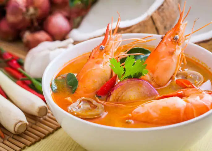 酸辣口感极为开胃,此汤是由鲜虾、散发着独特香气的香茅、清新的柠檬草以及火辣的辣椒精心熬制而成。它在泰国享有极高的声誉,被誉为泰国的 “国汤”。其独特的风味和丰富的口感使其在众多美食中脱颖而出,成为泰国美食文化的重要代表之一。