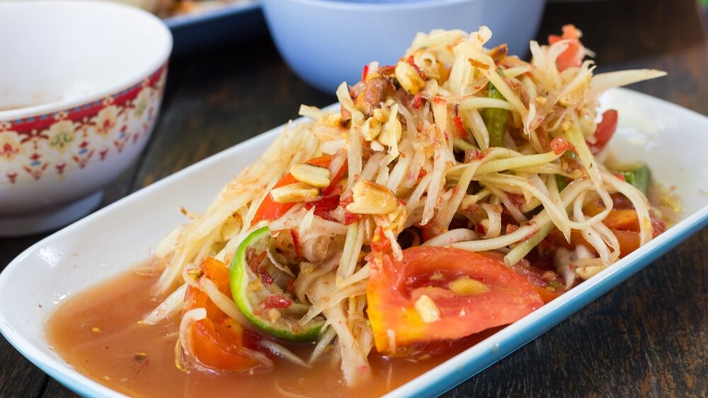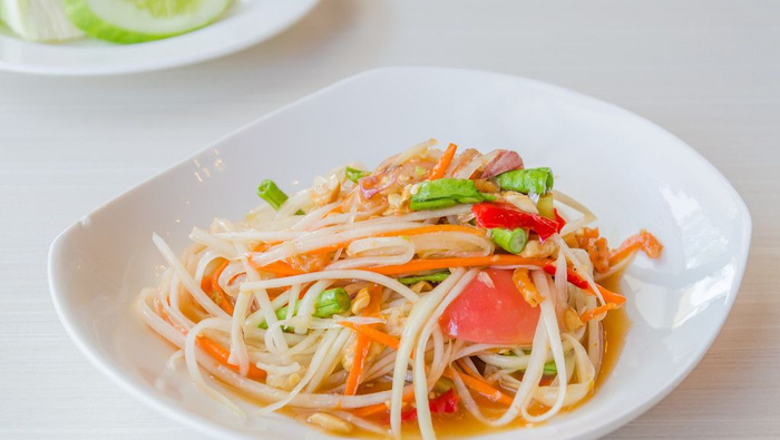 青木瓜丝巧妙地搭配上鱼露、辣椒以及花生,其口感酸辣脆爽,可谓是极为开胃。而且,它还具有有效地解腻之功效。这种独特的食材组合,为人们带来了极为丰富的味觉体验。鱼露所散发出来的鲜美滋味,与辣椒带来的刺激感相互交融,彼此映衬。再加上花生那香脆可口的口感,更是使得这道美食别具一格,独具魅力。无论是在炎热的夏日,还是在寒冷的冬日,青木瓜丝配鱼露、辣椒和花生,都能够让人食欲大增。它就如同餐桌上的一道亮丽风景,吸引着人们的目光,勾起人们的食欲。