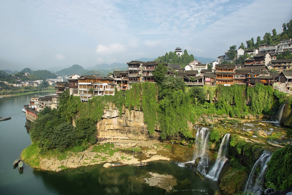 “挂在瀑布上的千年古镇”!白天看瀑布从吊脚楼间倾泻而下,水雾弥漫;晚上红灯笼亮起,瀑布映着灯光,比凤凰古城更静谧小众,适合慢慢逛。