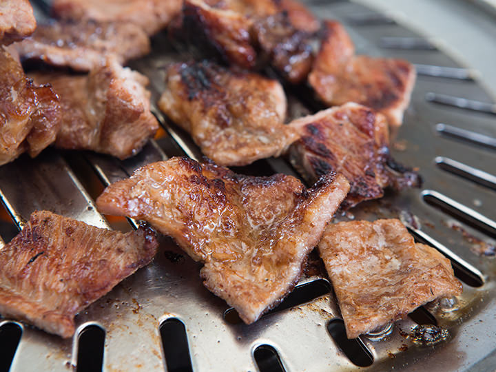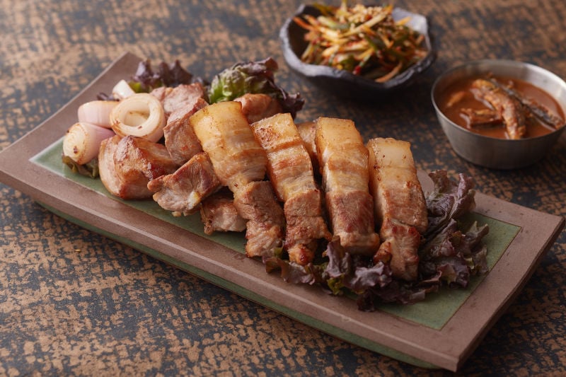 厚切五花肉才是yyds!炭火烤制后外皮焦香带脆,内里肥瘦相间、鲜嫩多汁,油脂香混着炭火香气扑鼻而来。蘸上韩式烤肉酱,用生菜叶裹上蒜片、青椒圈,一口塞进嘴里,油脂在舌尖化开,香而不腻,满足感爆棚!