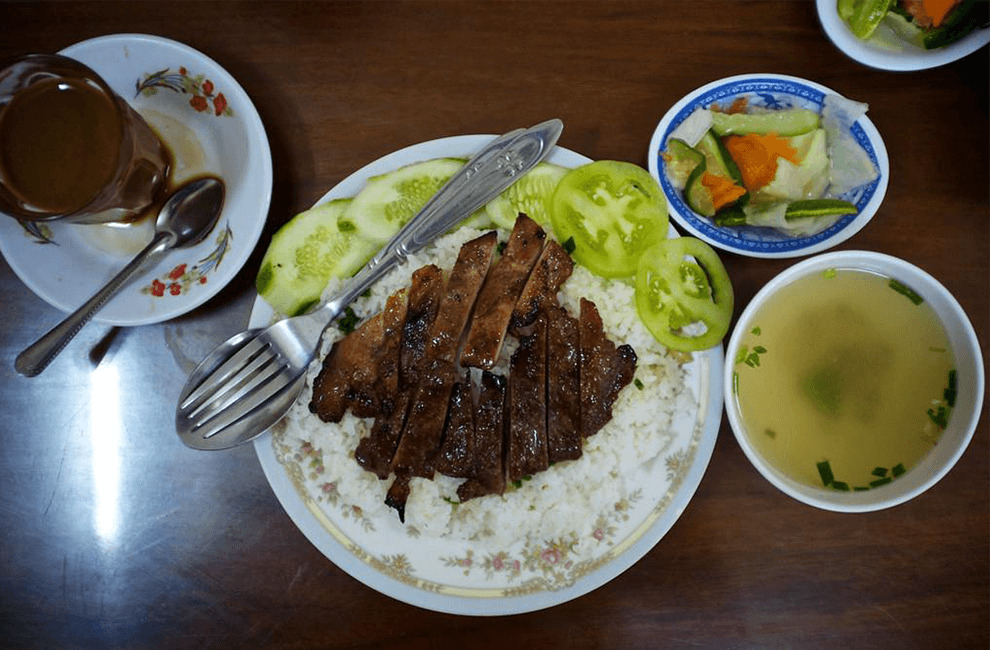 将切成薄片的猪肉在炭火上慢慢烘烤使其带有自然的清甜,有时候会把猪肉浸在椰汁或者蒜汁内烤好的猪肉放在一大份米饭上,再加上新鲜腌制的黄瓜和萝卜以及许多姜通常还会有一碗覆有大葱和油炸洋葱的鸡汤。