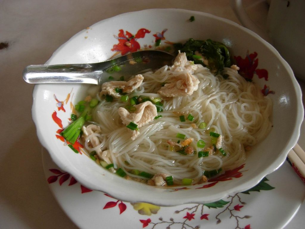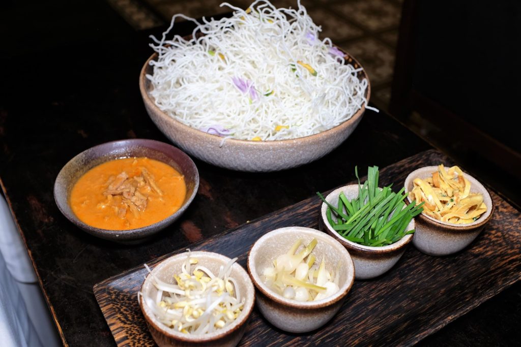高棉米粉十分美味,吃法跟云南的过桥米线差不多,这道主食胜在它的汤底主要是由椰子末、花生、虾末鱼末加上黄咖喱熬制而成口味十分特别,吃的时候只需要把面条以及其他附赠的蔬菜倒入汤中拌匀即可食用。