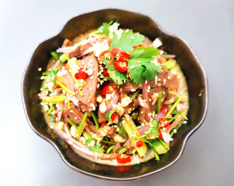 牛肉切成薄片,容易吸收酸橙汁,更像一道牛排而不是沙拉,这道菜受到喜爱偏生肉的柬埔寨男士的喜爱,但餐厅里往往会提供烤牛肉整道菜里有柠檬香草大葱、大蒜、鱼露、九层塔、薄荷、绿豆和青椒又甜又咸,辣味十足。