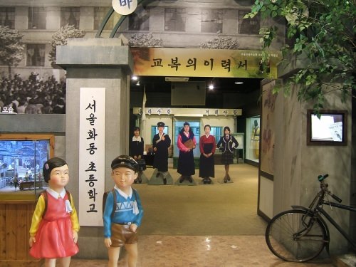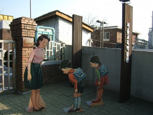 原计划中没有这一站。但是当我们一家人吃饭的时候,我一个人先吃完了想去个卫生间,就走出饭店去找。走着走着就发现了一个红色砖头建造的卫生间。方便完毕,发现对面平房前面站立着一个一米多高的乐高小人。走进一看,原来这里是首尔教育博物馆。