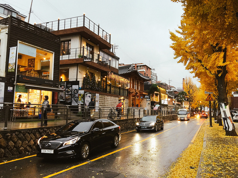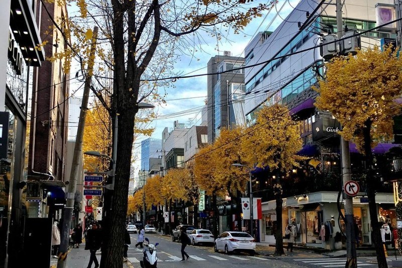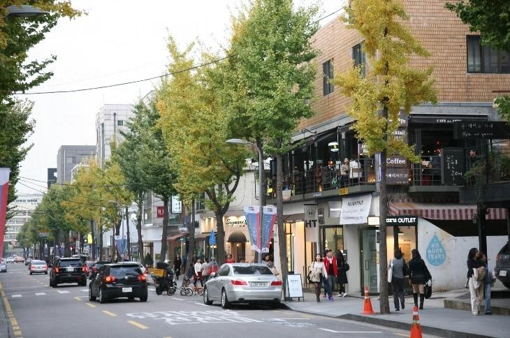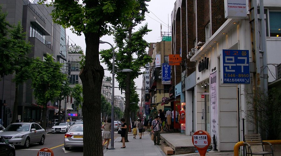 新沙洞林荫路是一条购物街,街上有一些别具一格的小店。我去的时候是上午 11 点左右,更不巧的是正好赶上了下雨,所以街上没有什么行人。其实即使不下雨,我认为街上的人应该也不会太多,因为韩国的年轻人都是夜猫子,很多时候下午或者晚上才会出来逛街。