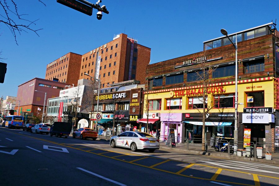 首尔的白天年轻人都忙于生计,是没有功夫来这里小酌一杯的。只有到了晚上,这里灯红酒绿。居住在首尔的,临时来首尔旅游的,黄种人,白种人,黑种人,只要是喜欢热闹的年轻人全都会来到这里消遣。巷子本身不是很宽,使得灯红酒绿下的梨泰院更具一股赛博朋克风。