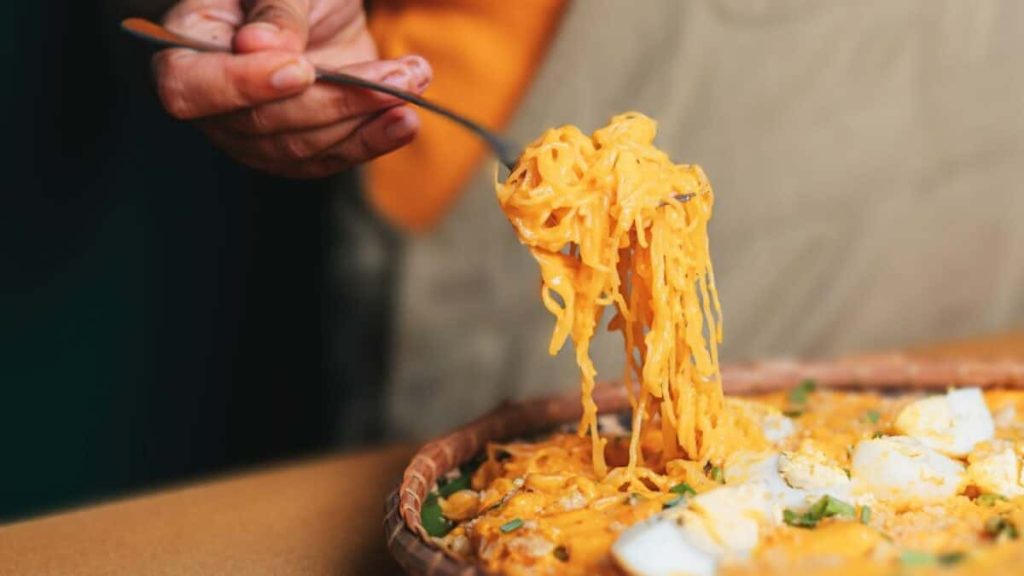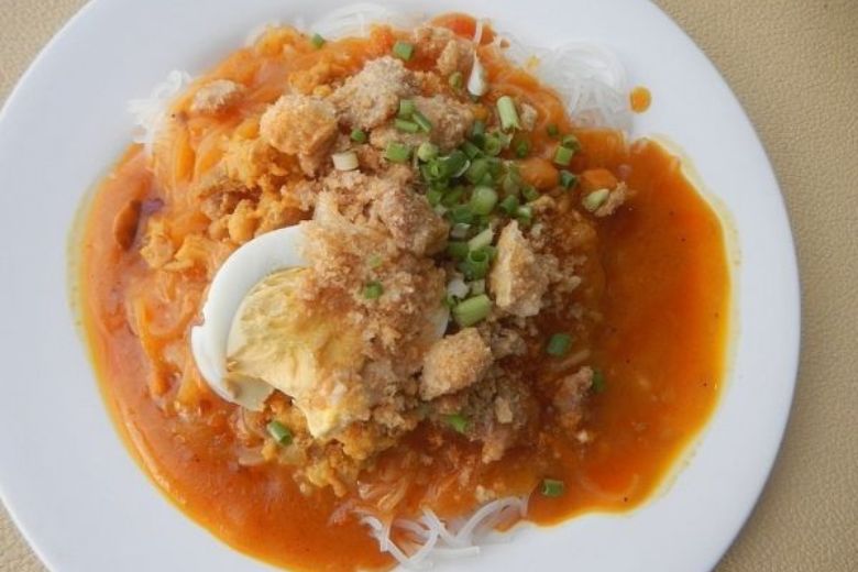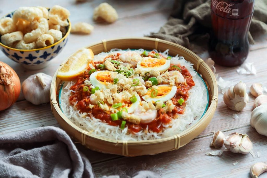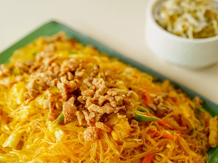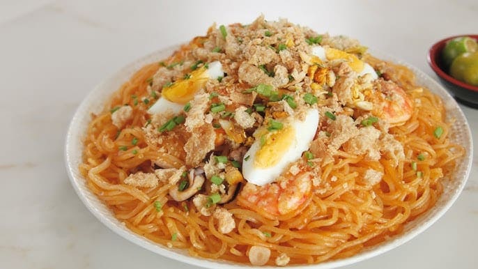 金黄色的虾酱,是整道菜的灵魂——用虾头慢火熬出的酱汁,浓郁鲜香。米粉被这层酱汁细密包裹,每一根都闪着油亮的金色光泽。上面铺满鲜虾、炸得香酥的鱼碎、翠绿的葱花、还有脆到咔嚓响的炸猪皮。最后挤上一点小金桔汁,那一抹清酸让整盘味道层次瞬间鲜活。